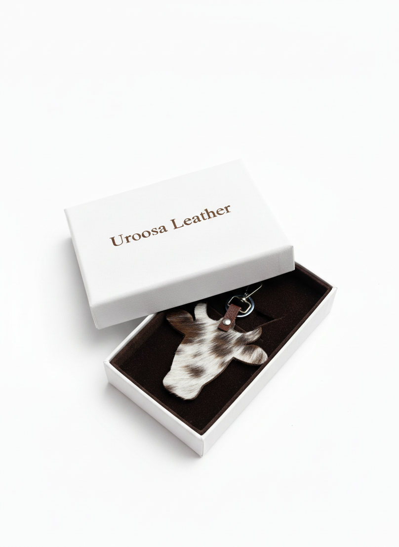 Add a rustic and stylish touch to your everyday accessories with the Cabello Hair-On Cow Leather Key Chain. Crafted from genuine hair-on cowhide and designed in a unique cow-head shape, this key chain is both eye-catching and durable. Perfect for keys, bags, or as a standout charm, it brings a natural Western look to your carry.
